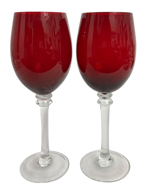 • Duo de taças para agua e ou vinho em denso cristal vermelho rubi. Mede 21,5cm.