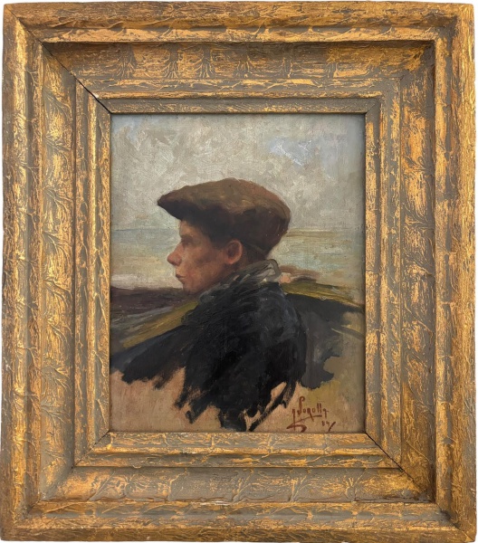 • JOAQUIN SOROLLA (Espanha 1863 / Espanha 1923) -  Obra em óleo sobre madeira "retrato de jovem", assinada no canto inferior direito, datada 84, proteção de moldura de madeira patinada em ouro velho. Medida da obra 21 x 27,5cm. Medida total 36 x 41cm.