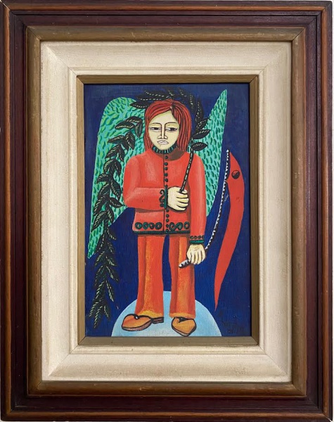 • TIAGO AMORIM -  Obra em acrílica sobre tela "anjo", assinada canto inferior direito, proteção moldura de madeira e paspatur. Possui recorte biográfico no verso. Medida da obra 20 x 30cm. Medida total 38 x 48cm.