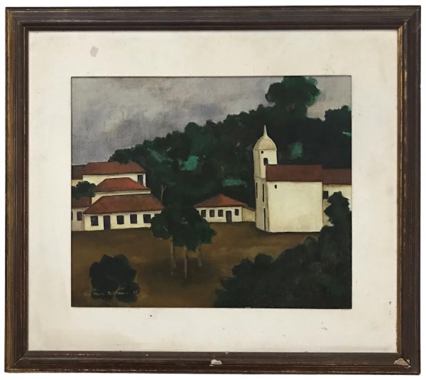 • ANA MARIA BOLTSHAUSER -  Óleo sobre tela representando "Paisagem com casas e igreja", assinada no canto inferior direito, datada 1980, protegida por paspatur e moldura de madeira no estado. Medida da obra  38 x 46 cm. Medida total 59 x 67cm.