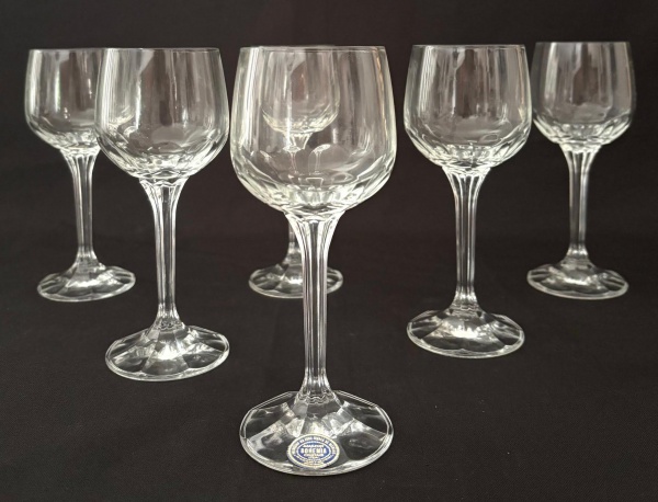 • BOHEMIA - Jogo de seis taças para vinho branco em cristal translucido da BOHEMIA com lapidação em dedões. Sem uso, com etiqueta, na caixa original. Mede 13,5cm.