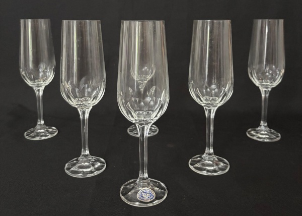 • BOHEMIA - Jogo de seis taças para champanhe em cristal translucido da BOHEMIA com lapidação em dedões. Sem uso, com etiqueta, na caixa original. Mede 20cm.