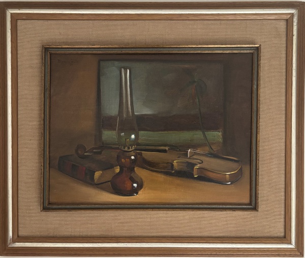 • BLANCO Y COUTO - Obra em óleo sobre tela "violino e lamparina", assinada e datada 84 no canto superior esquerdo, proteção de paspatur de tecido e moldura de madeira. Medida da obra 32 x 42cm. Medida total 51 x 61cm.