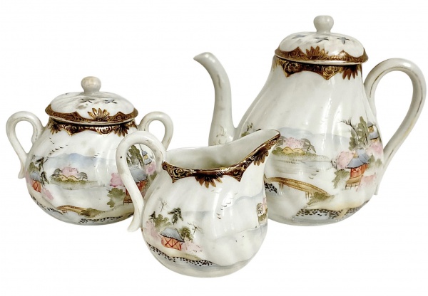 • JAPAO - Trio de serviço para chá em delicada porcelana oriental, dito casca de ovo, composto de bule e açucareiro com suas respectivas tampas e leiteira, adornados com flores, casario em policromia e vibrante ouro, meados séc. XIX. Medida do maior 16cm.