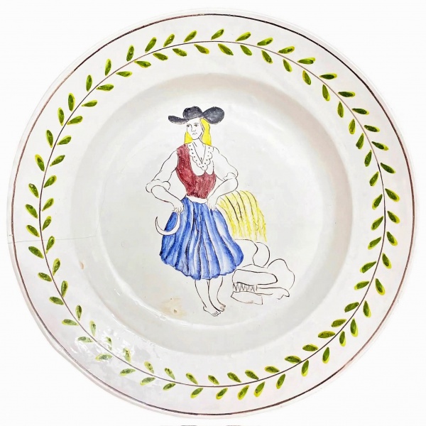 • PORTUGAL - Medalhão para parede em faiança portuguesa adornada com figura humana feminina ao centro e ramalhete de flores. Registro e assinatura no verso. Mede 31,5cm diâmetro.