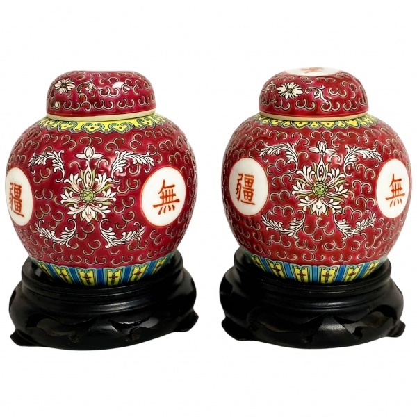 • CHINA - Par de potiches em porcelana oriental fartamente adornados com motivo floral sobre fundo magenta, apoiados sobre peanhas de madeira entalhadas. Possui registro na base. Uma das tampas com sinal de restauro. Mede 15cm altura cada.