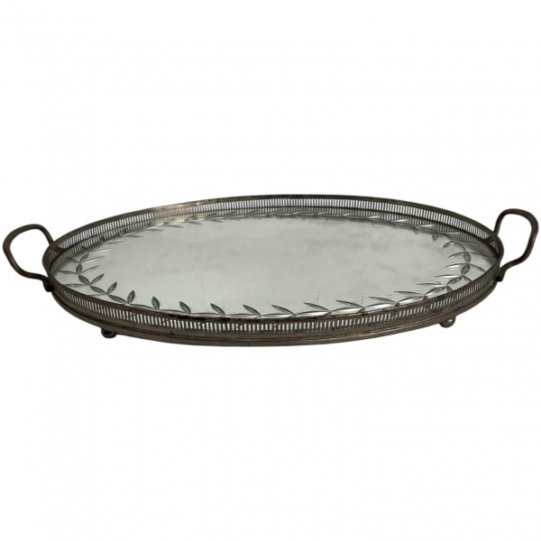• Bandeja para bebidas em metal vazado e cristal lapidado sobre madeira, formato ovalado com alças. Meados anos 50. Mede 48 x 31cm.