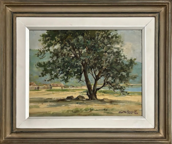 • GASTÃO FORMENTI (Guaratinguetá 1894  Rio de Janeiro 1974) - Obra em óleo sobre madeira "Itaipú"assinada no canto inferior direito, datada 1953, inscrição, assinatura e data no verso, proteção de paspatur e moldura de madeira patinada. Medida da obra 36 x 27cm. Medida total 50 x 42cm.