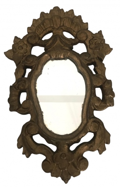 • Gracioso espelho de parede em madeira entalhada e dourada, com decoração floral e recortes vazados em estilo rococó. Peça de caráter decorativo e artesanal. Mede 30cm x 20cm.