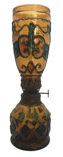 • Lampião antigo em vidro âmbar moldado e pintado à mão com motivos geométricos e florais em verde e vermelho, base e queimador metálicos. Inscrição em relevo na base MADE HONG KONG. Mede 21cm de altura.