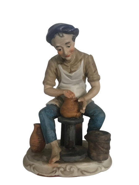 • Escultura em porcelana pintada à mão, representando oleiro no torno de cerâmica, ricamente detalhada. Base forrada em veludo vermelho, com etiqueta Made in Taiwan. Mede 18cm x 13cm.