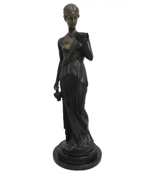 • Imponente escultura em bronze maciço patinado representando Hígia, deusa grega da saúde, sobre base circular em mármore negro. Figura clássica com cálice e serpente, em trajes esvoaçantes.Mede Altura: 63 cm.