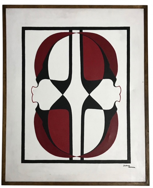 • IRACY CARISE  Obra geométrica e simétrica da artista Iracy Carise, executada em acrílica sobre tela, explorando formas orgânicas e contrastes entre o preto, branco e vermelho. A composição sugere um diálogo visual entre linhas e volumes, criando um efeito de espelhamento e equilíbrio. Assinada no canto inferior direito. Proteção de moldura de madeira estilo baguete.Medida total 72 x 58cm.