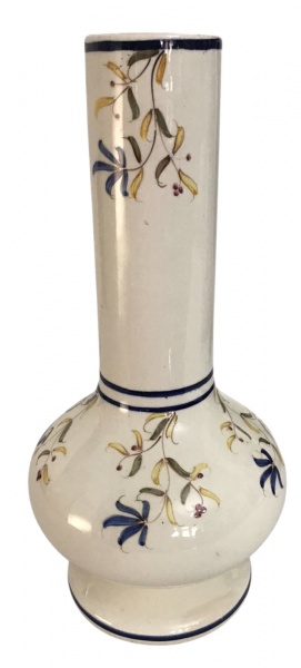 • Vaso em faiança esmaltada branca, de corpo globular e gargalo alongado, decorado com delicados ramos florais em tons de azul, verde e amarelo, contornado por filetes azuis. Peça de fino acabamento e graciosa estética artesanal. Mede 31cm.