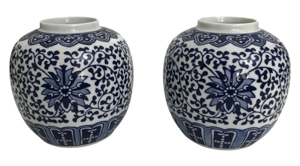 • Par de vasos em porcelana branca oriental decorada em azul cobalto, com motivos florais e arabescos. Peças de formato globular, inspiradas na tradição da porcelana chinesa, de excelente acabamento e elegância decorativa. Mede 13cm.