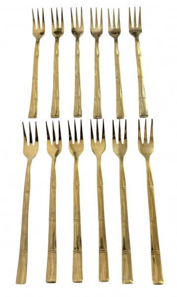 • Jogo de 12 elegantes garfos confeccionadas em metal com acabamento em dourado brilhante. Cada peça apresenta cabo com delicada textura que remete ao bambu, conferindo um charme natural e sofisticado à mesa posta. O design contemporâneo aliado ao tom dourado agrega requinte e versatilidade, ideal para compor serviços de chá, café ou sobremesas com um toque de luxo.Mede 19cm.