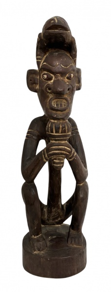 • ÁFRICA - Singular escultura artesanal em madeira maciça, representando figura antropomórfica em posição de vigília, com expressivo semblante e traços rústicos que ressaltam o caráter primitivo e ritualístico da peça. Os detalhes esculpidos à mão, incluindo ornamentos na cabeça e nas mãos, evidenciam a força simbólica e a tradição cultural de arte tribal africana.Acabamento em tom natural escuro, com pátina suave que realça as texturas e o entalhe minucioso.Dimensão: 51 cm de altura.Uma obra que une a força da ancestralidade ao charme do artesanato étnico, perfeita para colecionadores e amantes de arte primitiva e decoração de interiores