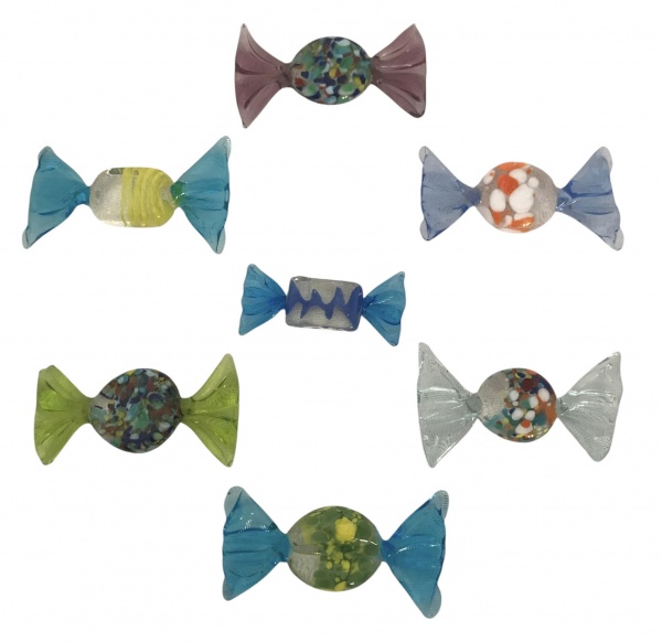 • Conjunto de 7 esculturas em vidro artístico de Murano, em forma de balas coloridas, cada uma com composição cromática e formato distintos. Mede 8cm cada.