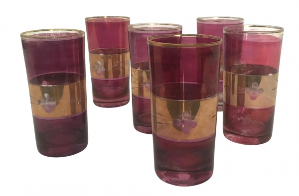 • Conjunto de 6 copos em vidro cor rubi, com faixa central dourada e decoração floral em relevo. Peças elegantes, ideais para composição de mesa posta ou bar. Mede 14,5cm de altura.