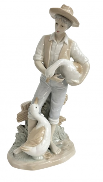 • ESPANHA - Escultura em pasta de porcelana espanhola esmaltada representando "figura masculina com gansos". Mede 27cm.