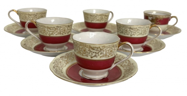 • TOKYO CHINA - Jogo de seis graciosas xícaras para café em pasta de porcelana oriental adornadas com contorno na cor magenta e arabescos em vibrante ouro. Possui registro. Acompanha os seus respectivos pires.