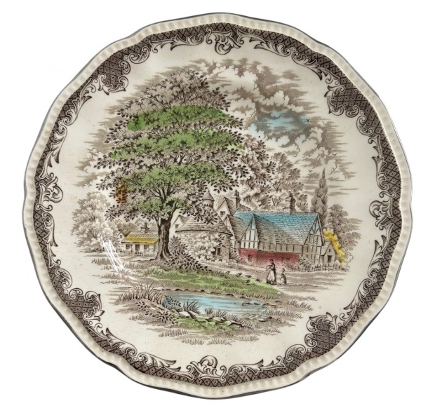 • Prato raso adornado com cena galante policromada em porcelana. Shakespeares Sonnets, Anne Hathaways Cottage, Kensington. Possui manufatura no verso. Mede 20cm de diâmetro.
