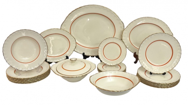 • INGLATERRA - Aparelho de jantar para 6 pessoas em faiança inglesa filetada a ouro,  manufatura CREAMPETAL GRINDLEY ENGLAND contendo 23 peças sendo 6 pratos rasos, 6 pratos fundos, 6 pratos para pão, uma sopeira com tampa, 1 tigela e 3 travessas. Medida do maior 42cm x 34cm.