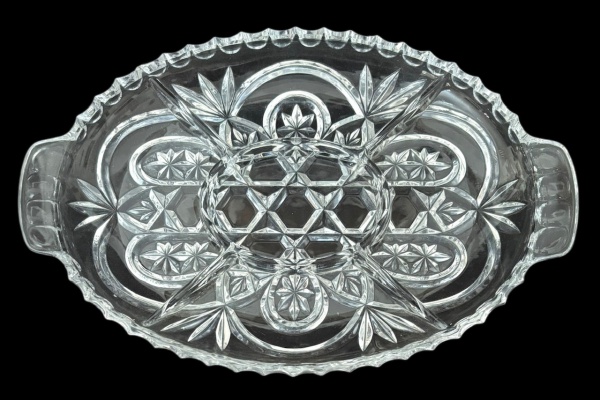 • Petisqueira com alças em cristal translúcido, formato ovalado com cinco repartições no interior. Mede 34,5 x 22,5cm.