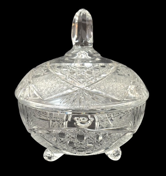 • TCHECOSLOVAQUIA - Antiga bomboniere em denso cristal tcheco translúcido com farta lapidação multi facetada. Acompanha sua respectiva tampa com pega no formato pinha. Mede 18cm altura.