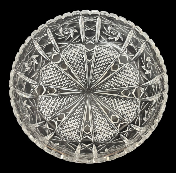• Centro de mesa formato circular em cristal translúcido lapidado e borda entrecortada. Mede 24cm diâmetro.