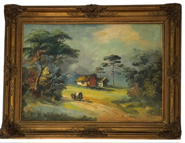 • Obra em óleo sobre tela, paisagem rural, assinada no canto inferior direito, proteção de moldura adornada com volutas nas extremidades. Apresenta sinal de restauro. Medida da obra  46cm X 65cm, medida total 80cm x 61cm.
