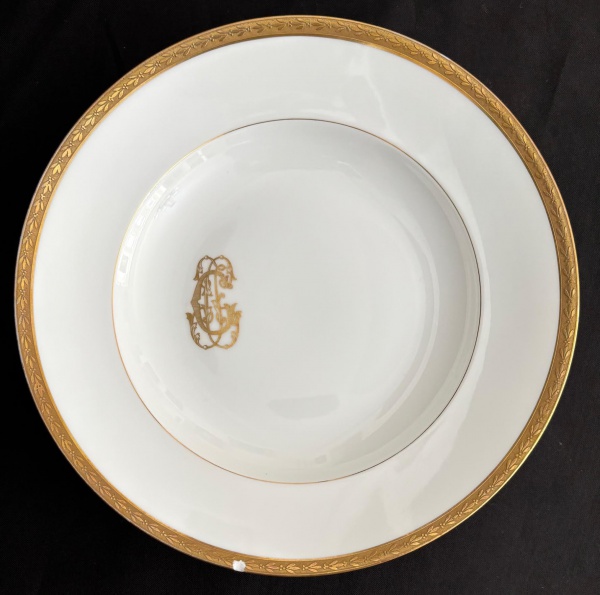 • LOUÇA DO IMPÉRIO - Prato fundo em pasta de porcelana francesa LIMOGES adornado com friso em vibrante ouro e monograma do arquiteto, pintor e capitão JOAQUIM CÂNDIDO GUILHOBEL (Lisboa, 1787 - Rio de Janeiro, 1859). Louça da aristocracia do Império Brasileiro. Possui discreto bicado. Mede 25cm.