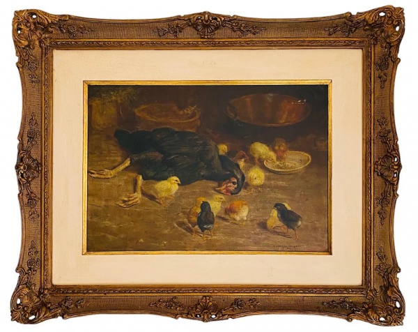 • GUERRINO GROSSO (Rio Claro, 1907 - São Paulo, 1988) - Obra em óleo sobre tela "cena rural", assinada no canto inferior direito, datada 1940, protegida por imponente moldura de madeira adornada com florões e acabamento em ouro velho. Medida da obra 55 x 38cm. Medida total 67 x 83cm.Nota do artista:  filho de italianos, foi pintor e desenhista, além de sócio-fundador da Associação Paulista de Belas Artes. Suas obras figuram nas pinacotecas de Rio Claro, Jaboticabal, Amparo, São Carlos, Piracicaba, e outras cidades, bem como em muitas coleções particulares no Brasil e no exterior, como Portugal, Itália, Chile, Estados Unidos, Argentina, Canadá e outros. Suas naturezas-mortas são notáveis, bem como suas imagens do bucólico de cidades do interior do Brasil.