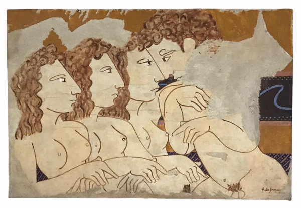 • HELIO BRAGA - Obra em óleo sobre tela sobre placa representando nus de figuras humanas, assinada no canto inferior direito. Ausência de moldura. Medida da obra 60cm x 89cm.