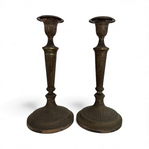• ENGLAND - Par de castiçais antigos em metal espessurado, trabalhados com estrias clássicas e base flautada ao estilo inglês. Pátina antiga preservada, desenho elegante e proporções equilibradas  peça decorativa de forte presença. Necessita novo banho. Mede 30 cm altura.