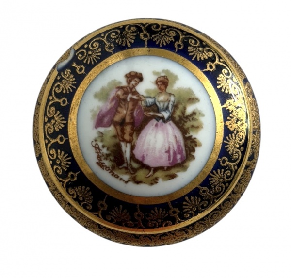 • LIMOGES FRANÇA - Porta pílulas em pasta de porcelana francesa Limoges, decorada com cena galante ao estilo rococó e bordas em azul cobalto com detalhes dourados. Peça de fino acabamento, típica dos objetos de arte franceses produzidos para toucador ou coleção. Discreto bicado na tampa. Mede 5 cm.