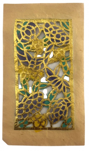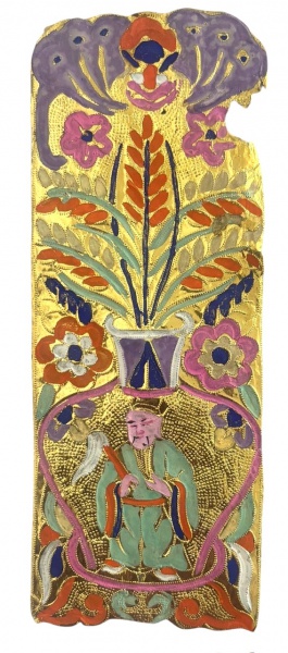 • CHINA SÉC. XIX - Antiga obra oriental em folha de ouro vazada sobre papel de arroz, com detalhes coloridos em verde, roxo e amarelo formando motivos florais e folhagens. Trabalho artesanal minucioso, típico de ornamentos decorativos usados em templos ou objetos cerimoniais no séc. XIX. Peça rara e de grande valor artístico. No estado. Mede 18,5 x 10,5 cm.