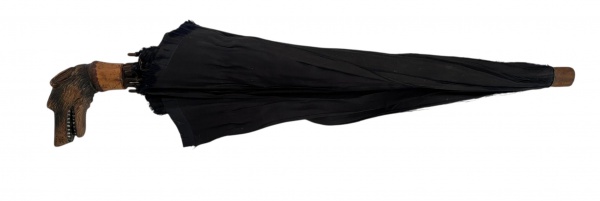 • SEC XIX - Antigo guarda-chuva com cabo artesanal em madeira entalhada, representando a cabeça de um cão com detalhes expressivos e olhos aplicados. Peça de grande personalidade, típica do início do século XX, unindo funcionalidade e arte popular. Item raro para colecionadores, ideal para acervo de curiosidades e objetos decorativos. No estado. Mede 55cm de comprimento.