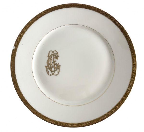 • LOUÇA DO IMPÉRIO - Prato em pasta de porcelana francesa Limoges, modelo Double Dorure, com borda em ouro e monograma JCG de  JOAQUIM CÂNDIDO GUILHOBEL (Lisboa, 1787 - Rio de Janeiro, 1859) arquiteto, pintor e capitão . Peça de refinado acabamento e origem nobre, representando a elegância das manufaturas francesas do período do império brasileiro. Possui discreto bicado. Mede 21,5 cm.