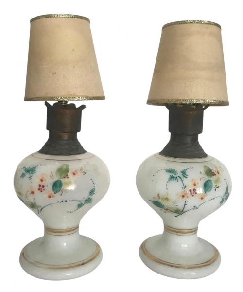 • Par de abat-jours em opalina leitosa pintado à mão com motivos florais policromados, detalhe em dourado e parte superior metálica. Cúpulas originais em tecido bege. Marcas do tempo. Mede 30cm x 10,5cm.