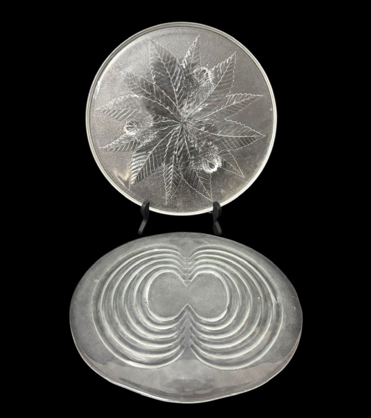 • Duo de pratos para bolo em pasta de vidro, formato circular, um adornado com flores. Medida do maior 31,5cm.
