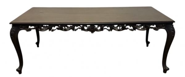 • Mesa de salão em estilo Luís XV, em madeira nobre, com pernas cabriolet e rica decoração entalhada no cinto, apresentando volutas e curvas elegantes. Tampo retangular de linhas suaves, conjunto harmonioso e decorativo, ideal para salas clássicas ou ambientes de destaque. Possui pequena perda na lateral. Medidas: 76 cm altura x 109 cm largura x 212 cm comprimento. Retirada: em apartamento no Flamengo, por conta e risco do arrematante.