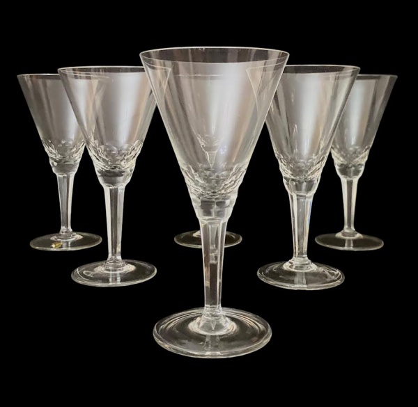 • Jogo de seis taças para agua em cristal translúcido lapidadas à mão. Sem uso, ainda com a etiqueta HERING. Período 1900. Mede 18cm.