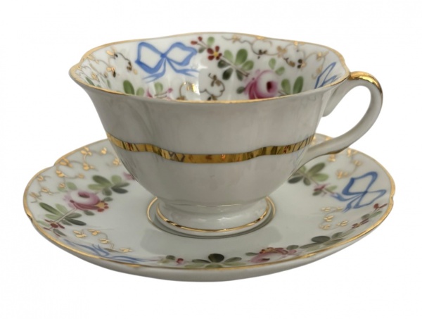 • PORTUGAL Xícara de cafe e ou coleção com pires em porcelana portuguesa Vista Alegre, decoração floral policromada com laços azuis, ricos detalhes em ouro e bordas onduladas. Marca VA Portugal na base. Peça delicada e elegante, em bom estado de conservação.