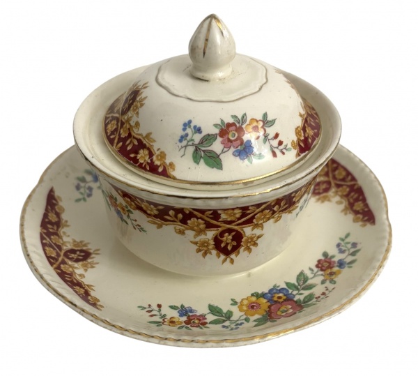 • INGLATERRA - Açucareiro com tampa e pires em faiança inglesa, marca Woods  Ivory Ware, Inglaterra com decoração floral policromada e guirlanda em tom vinho, detalhes dourados na borda. Base marcada, início séc. XX. Estado de conservação compatível com a idade, com craquelês e leves sinais de uso. Mede 15 cm diâmetro.
