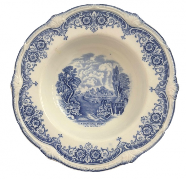 • ENGLAND - Prato fundo inglês Grindley  padrão A Lock on the Stour.Faiança inglesa azul com borda rendada e cena inspirada em Constable ao centro. Marca Grindley England no verso. Peça clássica para coleção ou mesa posta. Circa 1900.Mede 23 cm.