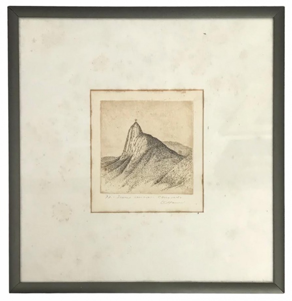 • Obra em litogravura, prova do artista, intitulada Ícones cariocas, corcovado, assinada no canto inferior direito, protegida por moldura de metal e vidro transparente. Pertenceu ao acervo pessoal da atriz Eva Wilma. Medida da obra 12 x 13cm. Medida total 30. x 31cm. Marcas do tempo.