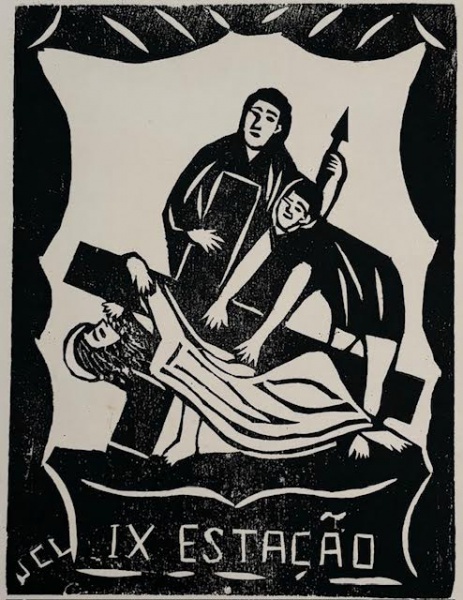 • JOSÉ COSTA LEITE (julho de 1927 Paraíba / agosto de 2021) - Xilogravura "IX estação". Cena tradicional da Via Sacra, executada com o traço firme e direto típico do mestre da literatura de cordel. Composição de forte contraste, figuras estilizadas e assinatura JCL. Obra representativa da produção nordestina popular. Medida da obra 17,5cm x 23cm. Medida total 33 x 47cm.