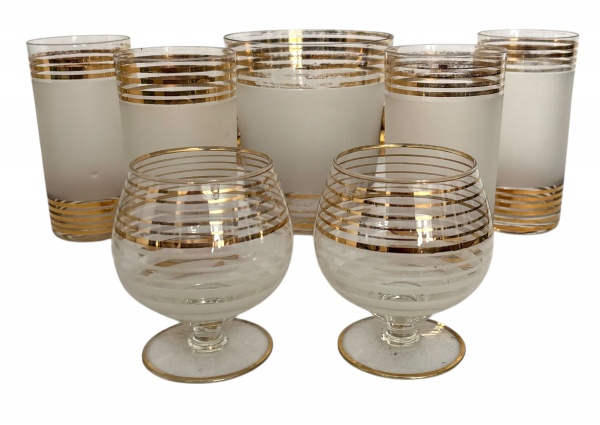 • ANOS 50 - Conjunto antigo de bar em vidro com filetes douradosBalde de gelo com alças e 6 copos: 4 altos foscos com filetes dourados e 2 taças baixas arredondadas.Detalhes em ouro, sinais naturais do tempo. Conjunto elegante para bar ou decoração vintage.  Medida do maior