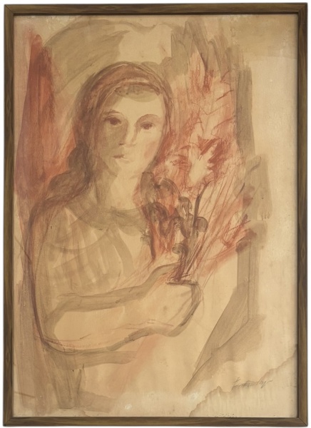 • Desenho/Pintura  Figura Feminina com FloresTécnica mista sobre papel, assinatura no canto inferior direito (ilegível).Composição delicada de figura feminina, traço expressivo e paleta suave em tons terrosos e rosados. Apresentada em moldura de madeira com vidro. Verso protegido, com sinais naturais do tempo. Medida total 72 x 51 cm.